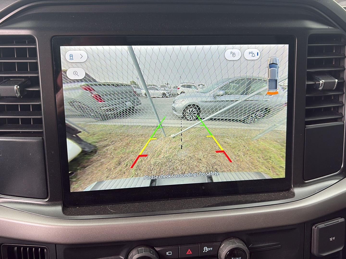 - The vehicle is equipped with a camera that displays an image of the area behind the vehicle on an interior display.